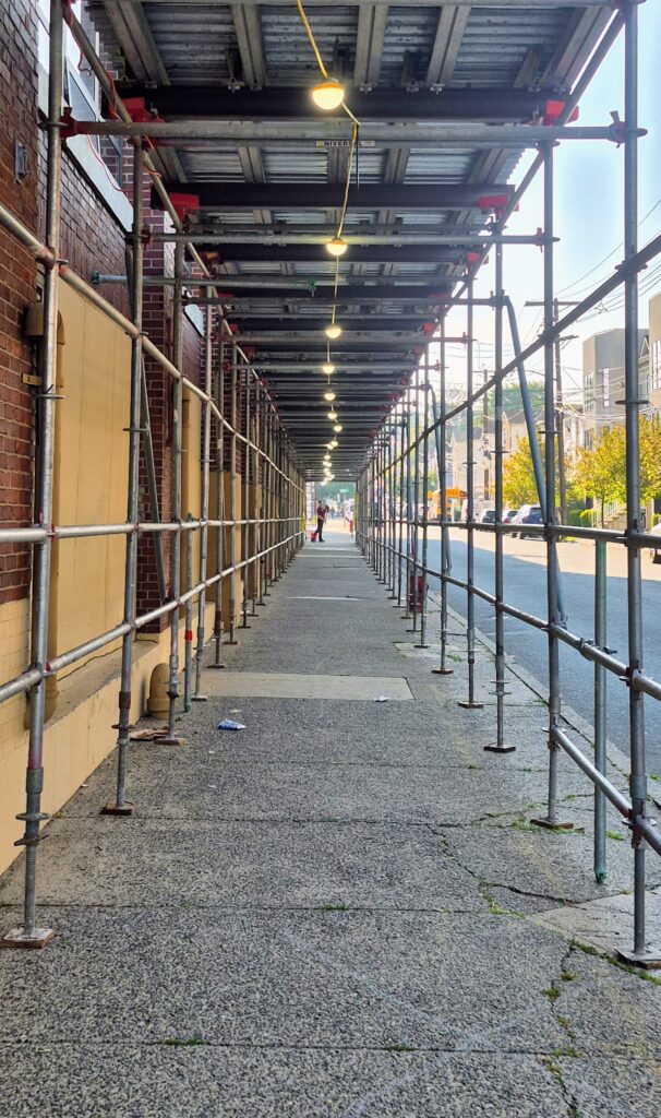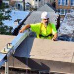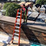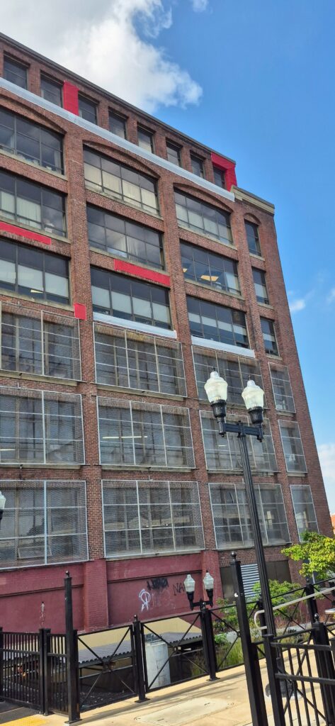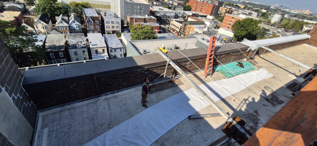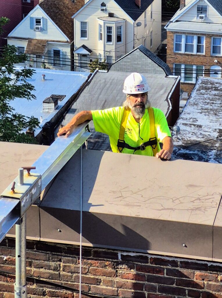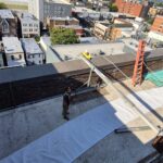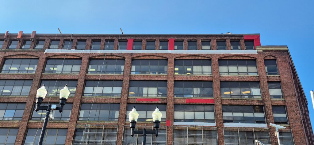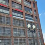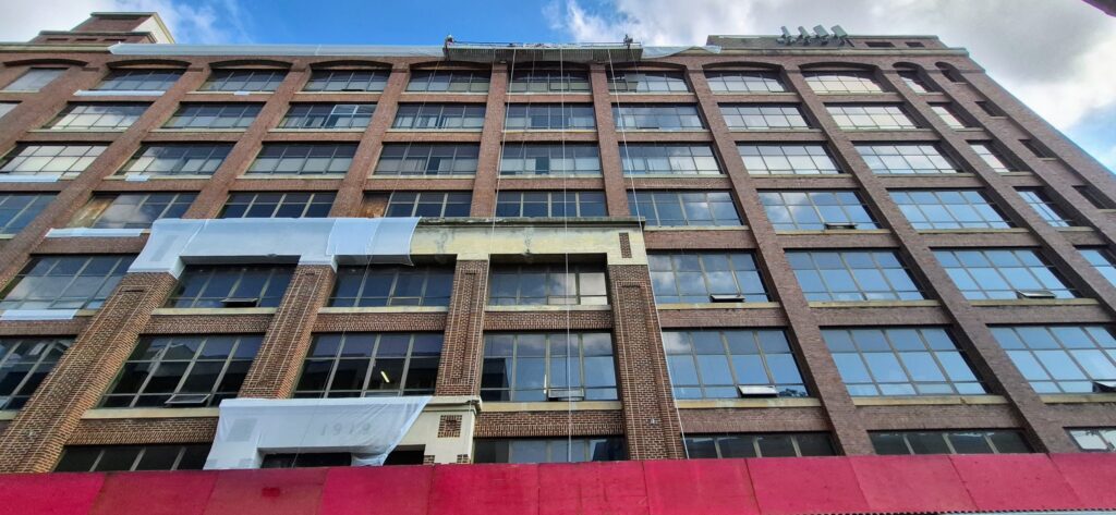 The Board of Education Building is a massive brick and concrete structure that needs quite a bit of masonry repair work, especially at the parapet. Our job is to install netting around the perimeter of the building to capture any debris that may fall until funding is allocated to perform the necessary repairs. The work is performed from swing stages and we used colored netting to help blend it to the building as best as possible.